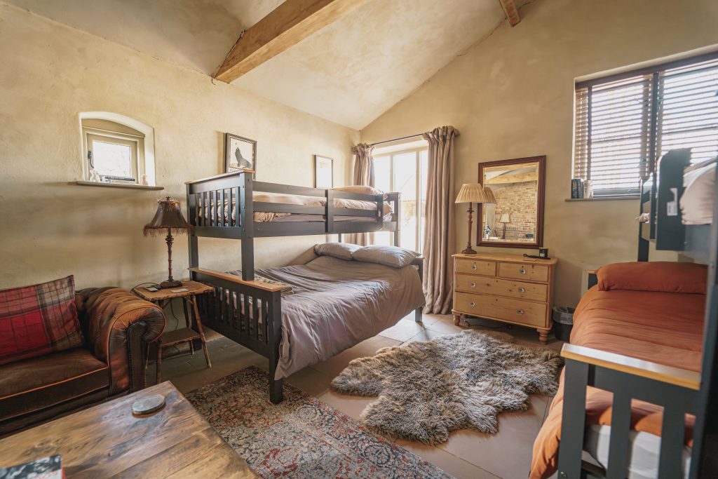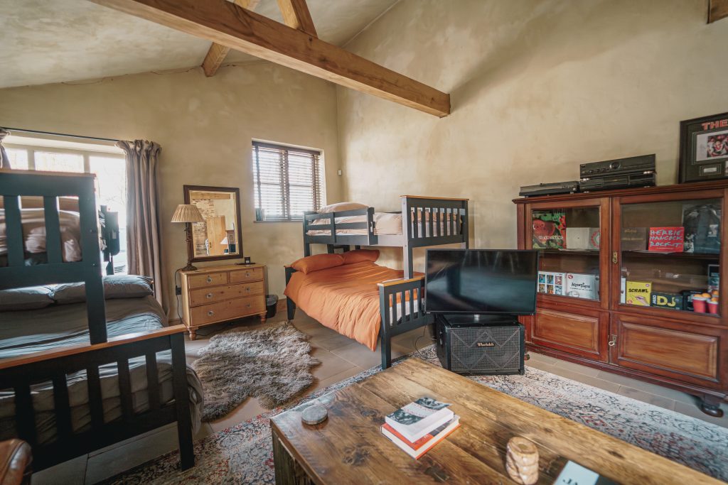 Welcome to our on-site recording studio accommodation. We’ve got four bunk beds – two doubles and two singles – so there’s room for six if you don’t mind getting close. Chill out with a TV and games, grab a meal at the dining table, and freshen up with our shower and toilet setup.